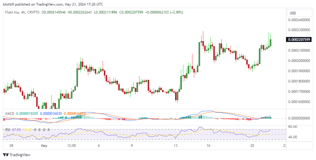Floki Inu price is currently at $0.00022, its highest level since early April.