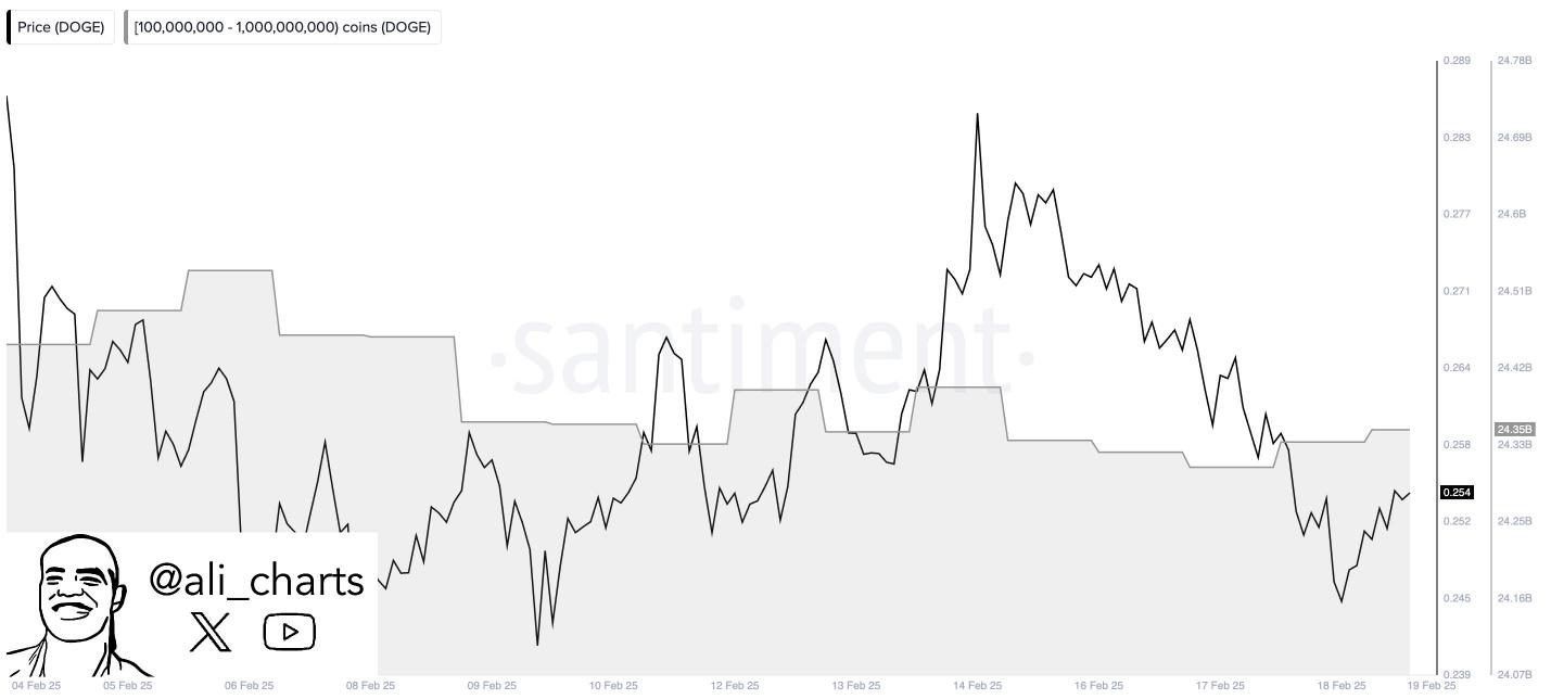 On-chain data also indicates a notable decline in whale activity. On Thursday, analyst Ali Martinez observed that large DOGE holders have adopted a “wait-and-watch” approach, with no significant buying or selling activity in recent days.
