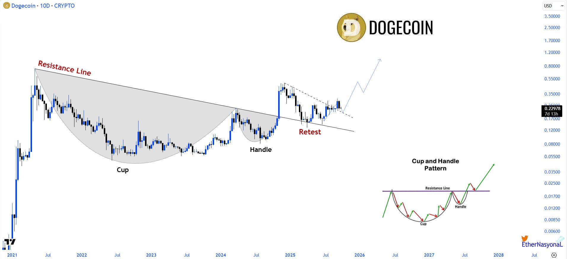 This ten-day chart shows that the coin has formed a cup-and-handle pattern, which may lead to a surge to $1 eventually. Such a move will be a 338% surge from the current level.