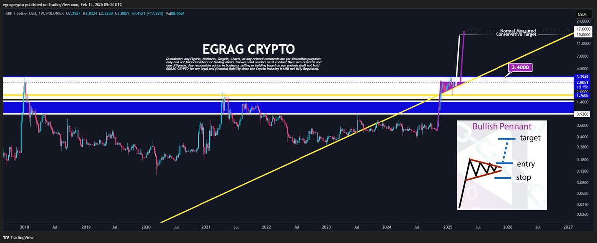 The crypto analyst assured that the bullish pennant formation remains intact, which could send XRP to this $17 target. However, he cautioned market participants not to celebrate until the crypto closes above $3.40. According to him, nothing is confirmed until XRP has a breakout with solid confirmation.