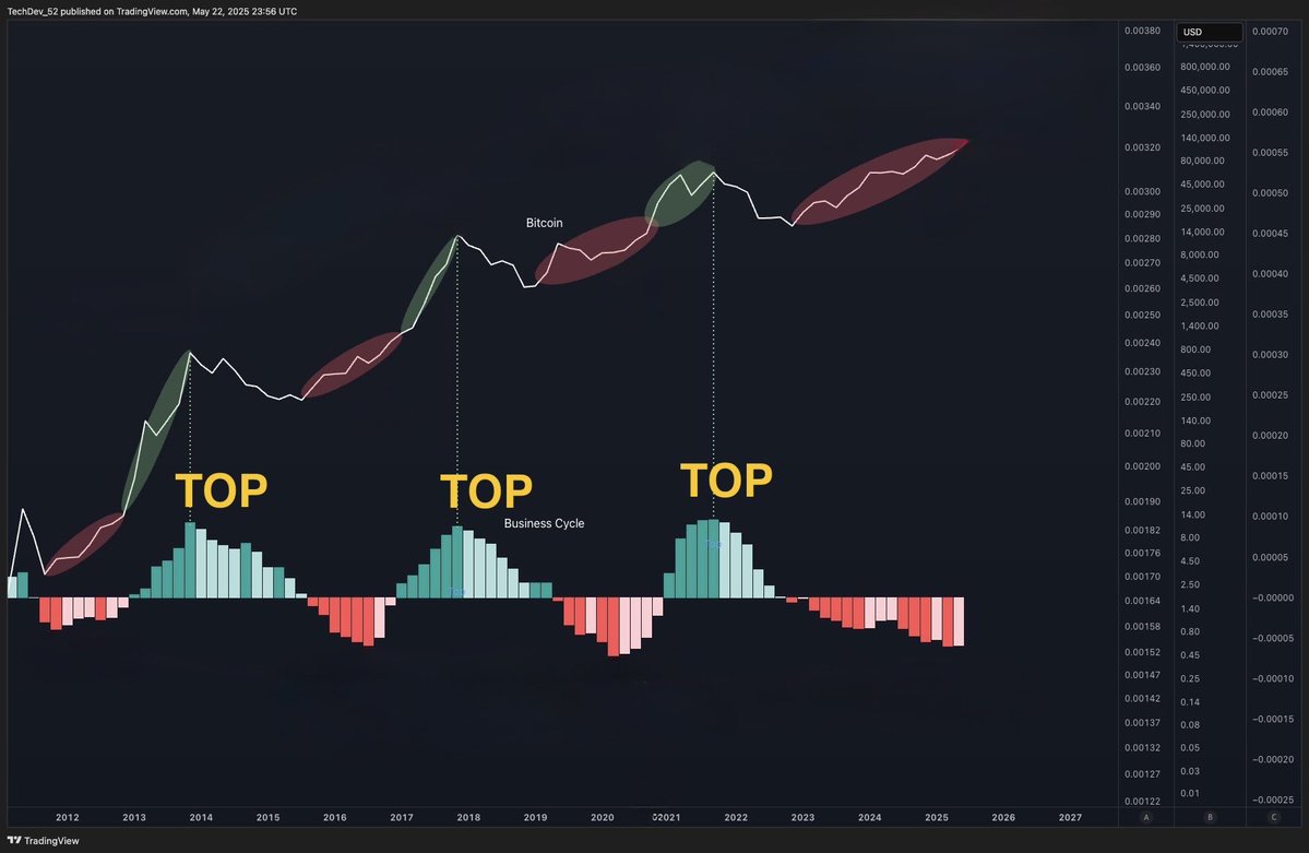 He believes Bitcoin’s cycles have been correlated to the performance of the overall macroeconomy. Based on his chart and historical patterns, the analyst suggests the business cycle is bottoming and may start to increase, which has coincided with massive Bitcoin rallies in 2013, 2017 and 2021, when the flagship crypto asset hit the cycle peaks.