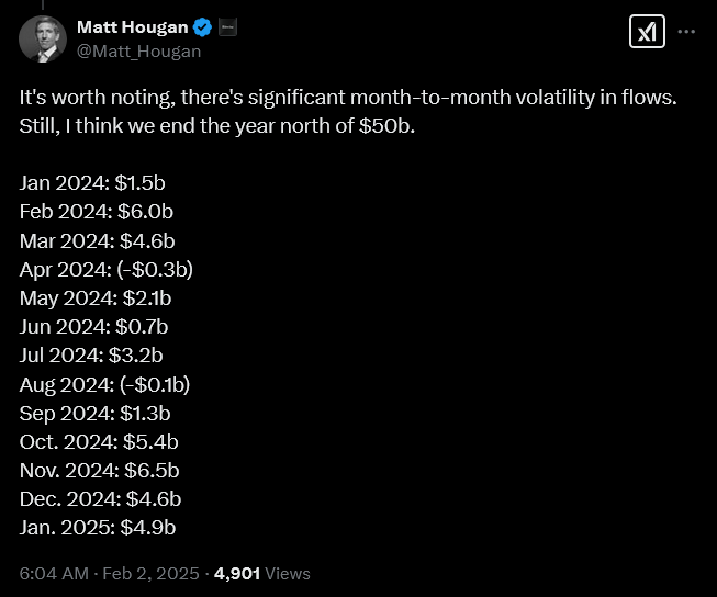 According to Matt Hougan, Chief Investment Officer at Bitwise, the year could end “north of $50b” for the group of ETFs.