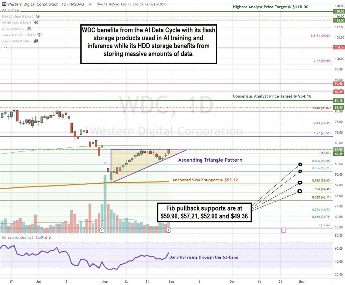 Western Digital’s average consensus price target is $84.16, and its highest analyst price target sits at $118.00. The daily anchored VWAP support sits at $53.12.