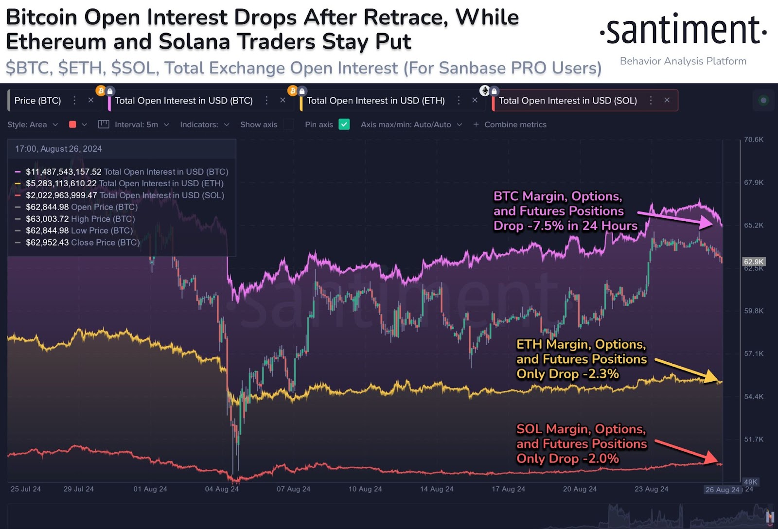 The larger drop in BTC open interest, compared to smaller assets, points to traders potentially seeing the August rebound coming to an end and trying to sell the top (as other Santiment data is also showing evidence of).