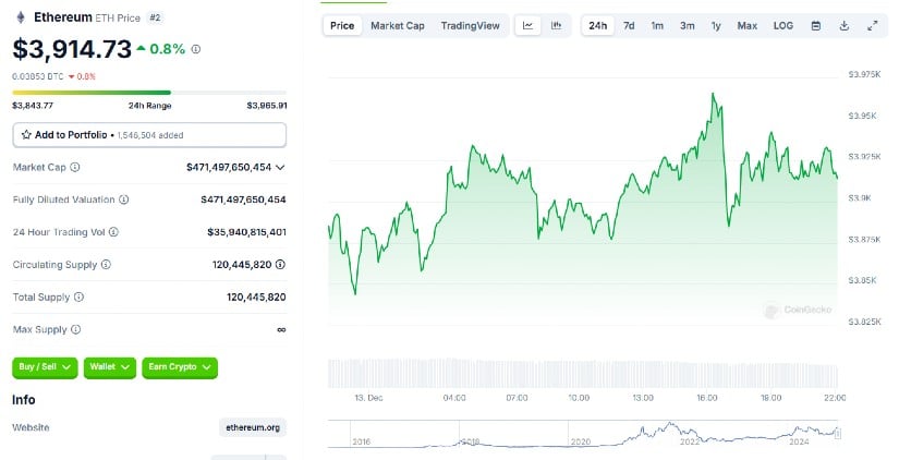 As of December 14, 2024, Ethereum (ETH) is trading at approximately $3,914.73, reflecting a 1.4% increase over the past 24 hours.