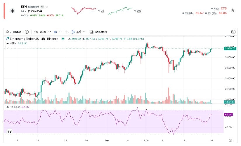 Technical analysis indicates that Ethereum is encountering significant resistance levels. The first major resistance is at $3,990, where profit-taking might happen.