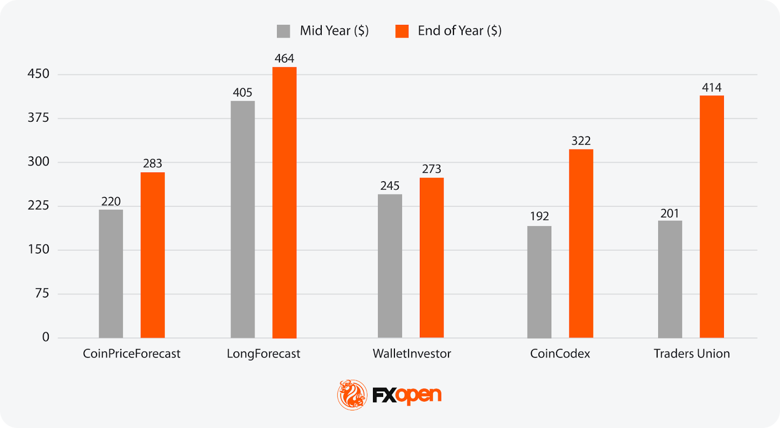 - Most Bearish Projection: 395 (WalletInvestor)