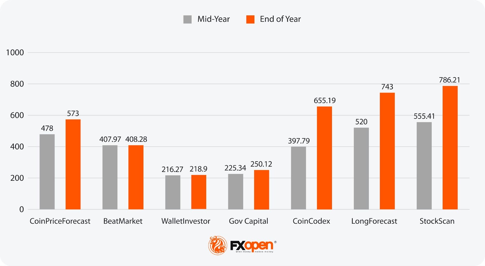 - Most Bullish Projection: 1181 (CoinPriceForecast)