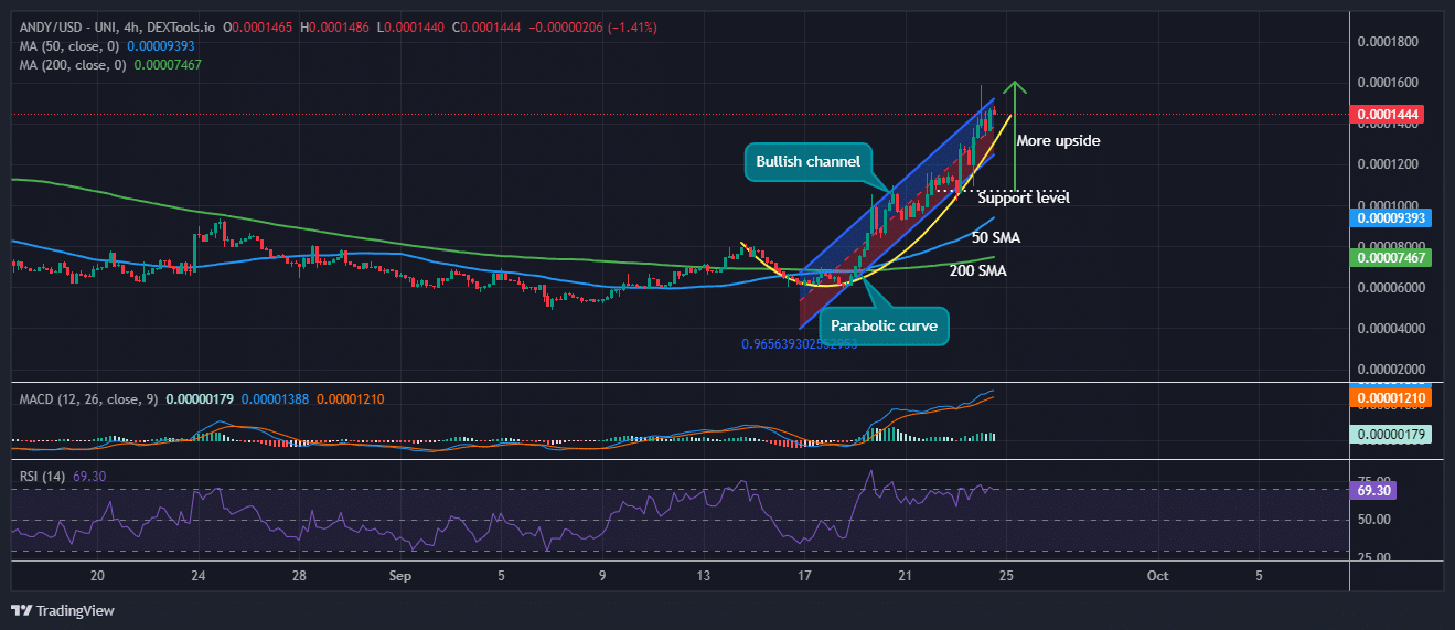 The ANDY/USD 4-hour chart shows a clear bullish trend, with price action forming a parabolic curve that evolves into a bullish channel. This suggests that buyers are in control, pushing prices higher.