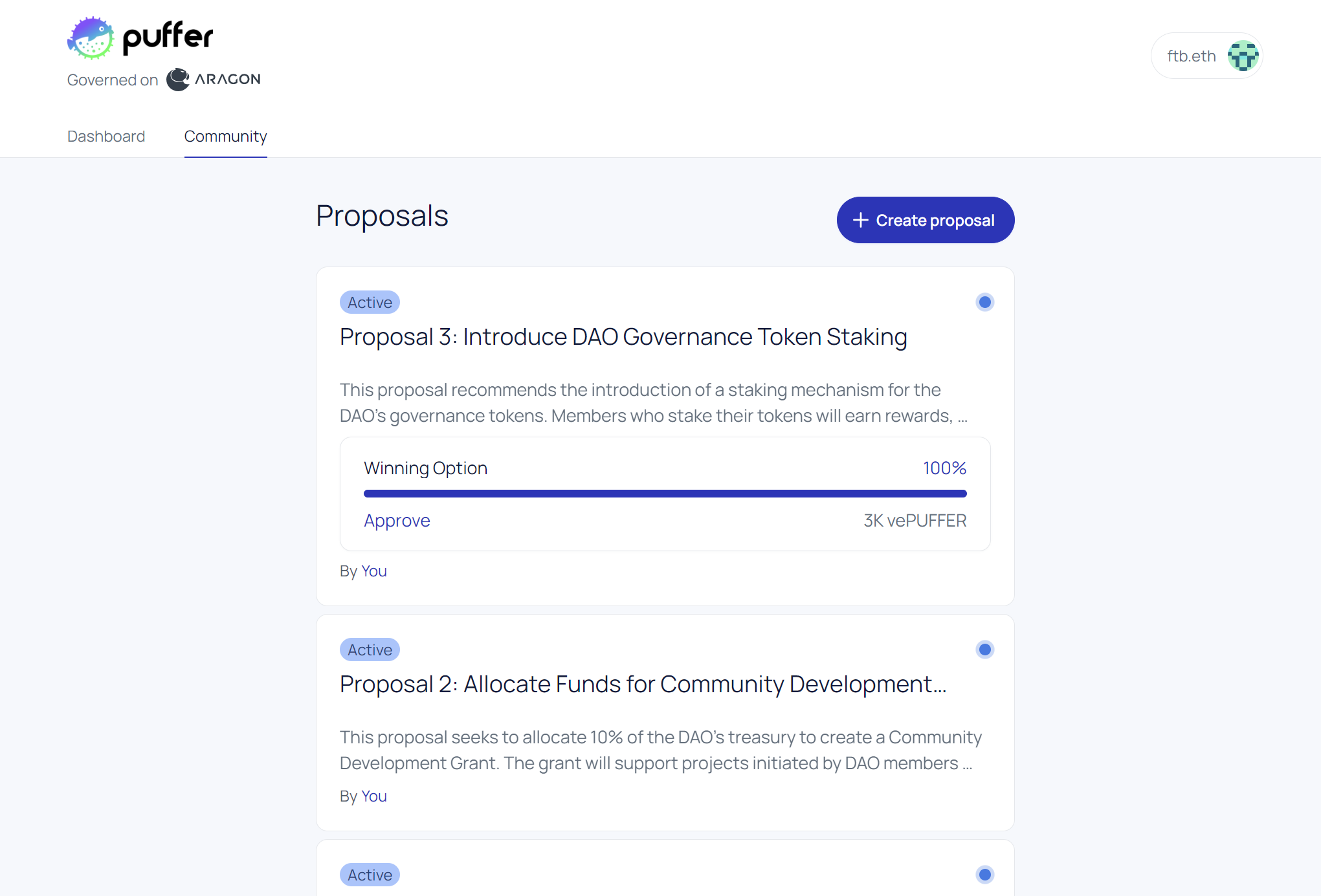 The Puffer community now has a dedicated home for governance. In the Puffer Governance Hub, vePUFFER holders can temporarily participate in signalling votes from day one. This is where future iterations of Puffer Governance will live, as the hub can adapt by adding the flows and features the community needs to participate in governance as it evolves over time, including moving to onchain governance in the upcoming versions of PUFFER governance.