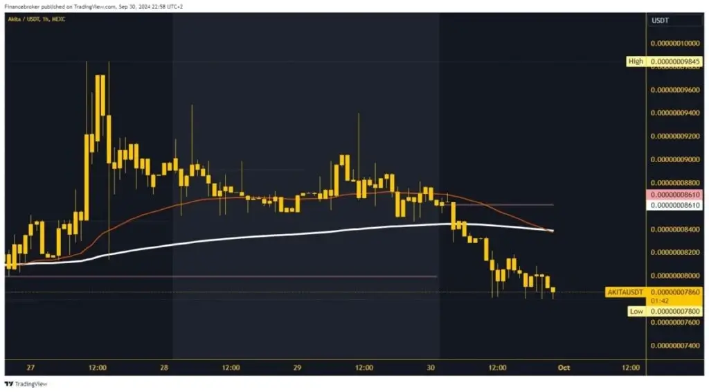 The price of Akita Inu rose to 0.00000009845 on Friday, hitting a new high. Later in the day, we saw the initiation of a bearish consolidation down to the 0.00000008500 support zone. Over the weekend, the price was in a sideways consolidation with the support of the EMA 200 moving average. Monday brought new volatility and a drop below the moving average and the 0.0000008200 level. We didn’t manage to stop there either; the Akita Inu price fell to 0.00000007800, a new weekly low.