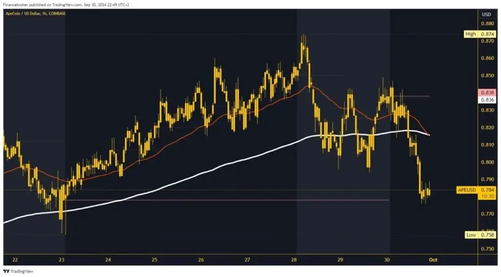 We saw the new September high price of ApeCoin on Saturday at the 0.874 level. We stayed up there for a short time because a bearish consolidation was quickly initiated and a drop to the 0.800 level. Then, on Saturday, we saw the first recovery to 0.840, where ApeCoin encountered new resistance and formed a lower high. On Sunday, the price once again tried to break through the resistance zone, but to no avail.