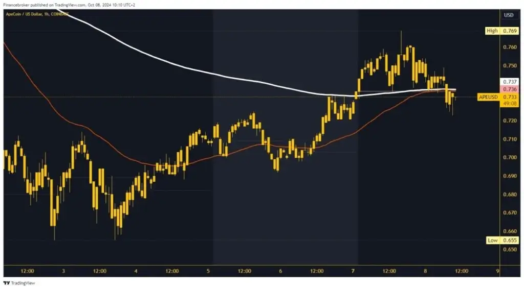 The new weekly high price of ApeCoin was formed yesterday at the 0.769 level. After that, the price goes on the defensive and begins bearish consolidation. This morning’s support at the 0.735 level did not hold, and we had to make a step below to the 0.720 level. A new weekly low was formed at that level. We saw a brief recovery to EMA 200 and 0.735, where we encounter new resistance. That could trigger another bearish consolidation below today’s low.
