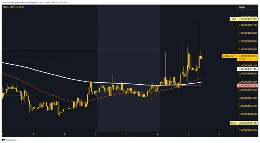 Over the weekend, Akita Inu’s price struggled with resistance in the EMA 200 moving average. Finally, on Monday, we saw a break above the EMA 200 and a strengthening of the bullish momentum. This morning the price finds new support at the 0.00000008000 level. This prompted Akita Inu to make a brief bullish impulse to 0.00000009349, forming a new weekly high there. After that, the price pulled back to 0.00000008380 and is now trying to stay there.