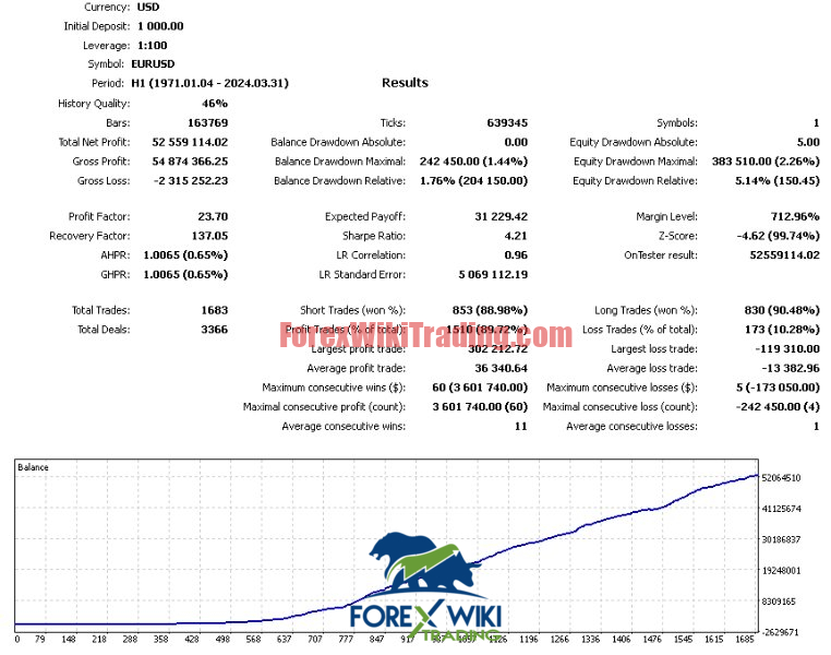The staggering backtest results ($52M profit from $1,000 deposit) may reflect over-fitting to historical data. Real-market conditions could yield less optimistic outcomes. -