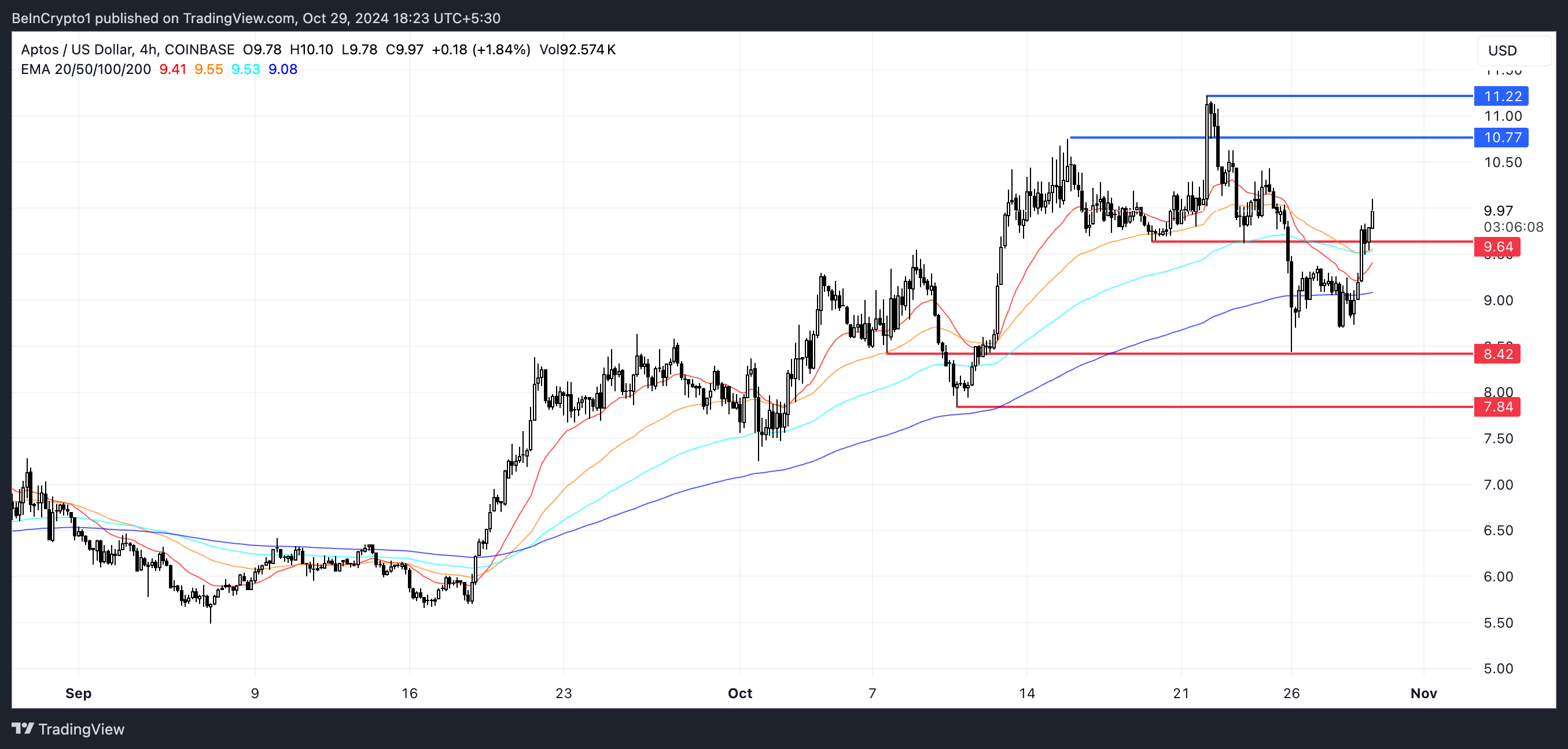Aptos EMA Lines and Support and Resistance Cloud. Source: TradingView.