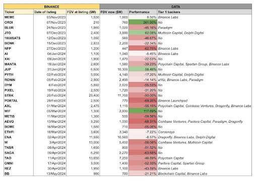 The macro researcher noted that when tokens launch at an elevated Fully Diluted Valuation (FDV), they tend to depreciate, ultimately underperforming. He disclosed that most of the tokens listed on Binance are backed by Tier1 VC and launched at extremely high prices, resulting in substantial profit taking and a significant decline.