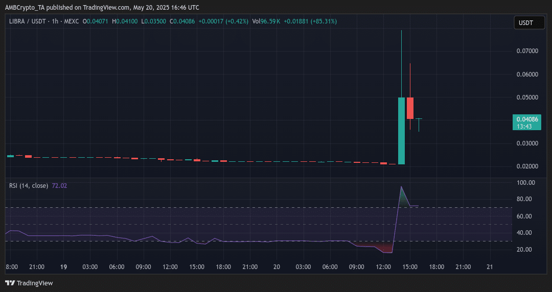 Regardless, the market reacted quickly. Following news of the UTI’s dissolution, LIBRA surged 85% in the hourly chart, at press time. The token jumped from $0.022 to a peak above $0.07 before correcting and stabilizing around $0.04.