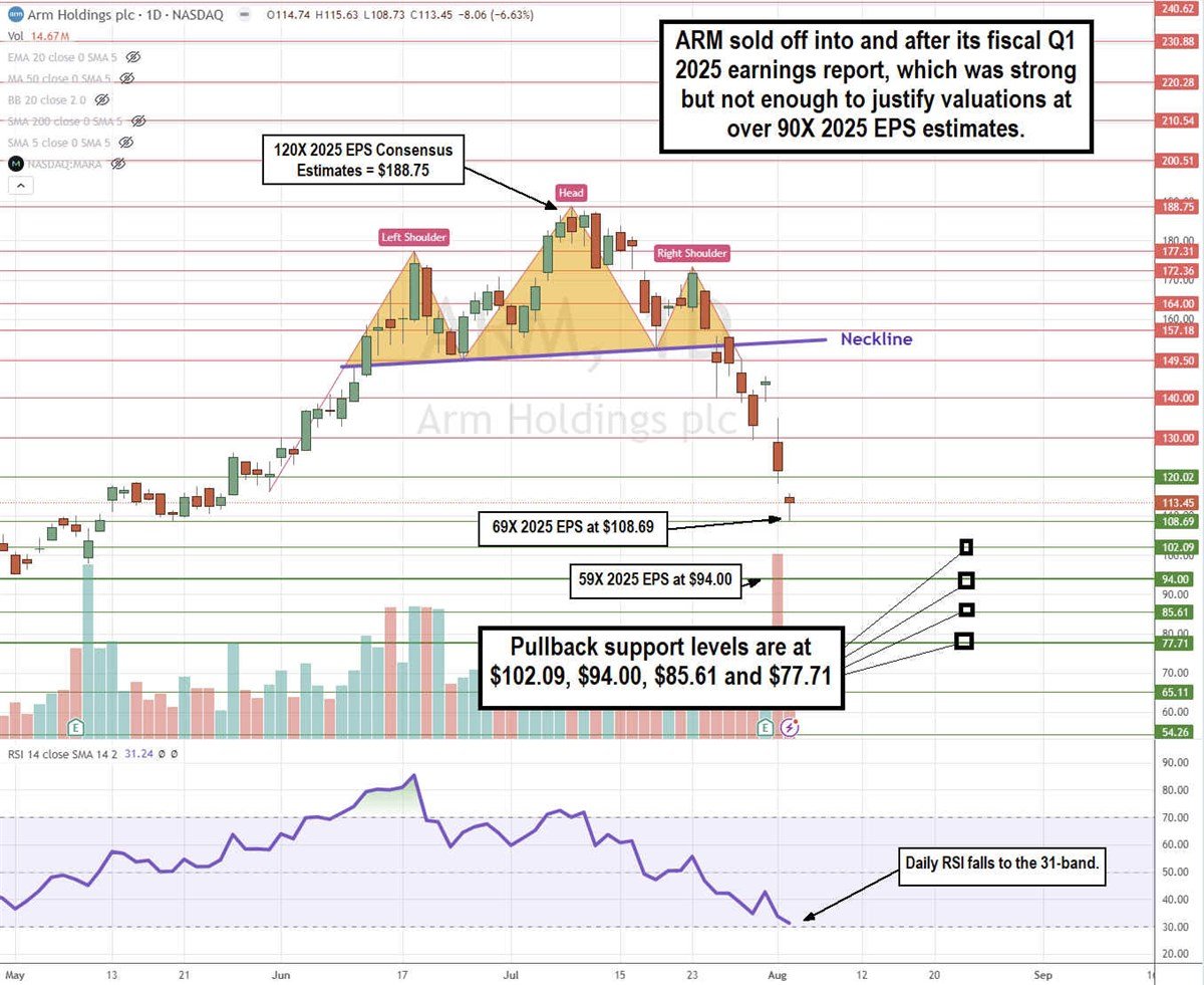 The daily candlestick chart for ARM illustrates a head and shoulders breakdown pattern. This pattern is comprised of three peaks. The left shoulder peaked at $177.31 and pulled back to the neckline at $149.50. The head has the highest peak at $188.75, and it is pulled back to the neckline at $152.22. The right shoulder is the final peak at $172.36, which triggered the breakdown through the neckline. The neckline breakdown occurred when ARM fell under $154.30 on July 26, 2024, ahead of its July 31, 2024, earnings release. The fiscal Q1 2025 results accelerated the selling, causing shares to plunge another 21% in the following days. The daily relative strength index (RSI) has plunged to the 31-band. Pullback support levels are at $102.09, $94.00, $85.61, and $77.71.