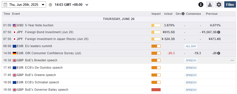 The Japanese yen showed renewed strength, with USD/JPY falling to 144.80—below the 145.00 psychological threshold—ahead of key Tokyo inflation and retail sales data due Friday. Consensus expects Tokyo core inflation to ease to 3.3% y/y in June from 3.6% in May, still well above the BoJ’s 2% target.