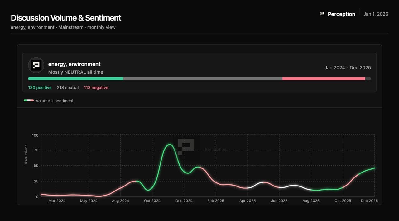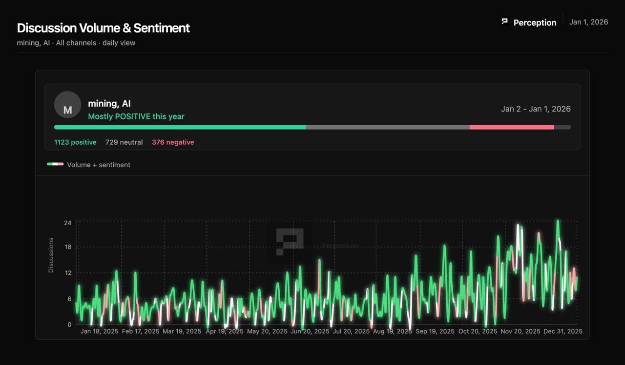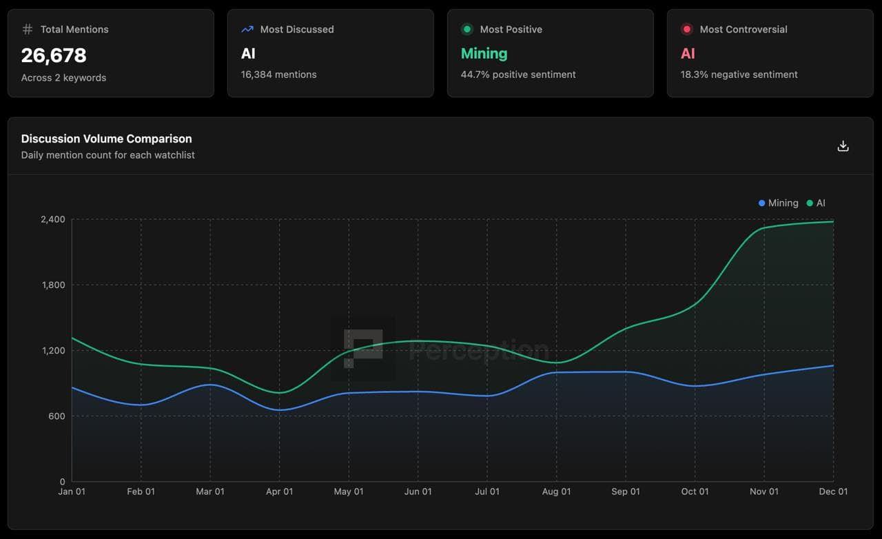 AI, as a topic, generated significantly higher discussion volume and sharper sentiment swings, with controversy outpacing bitcoin even as mining-related coverage, which was previously getting mostly negative coverage, skewed to more positive, Perception said.