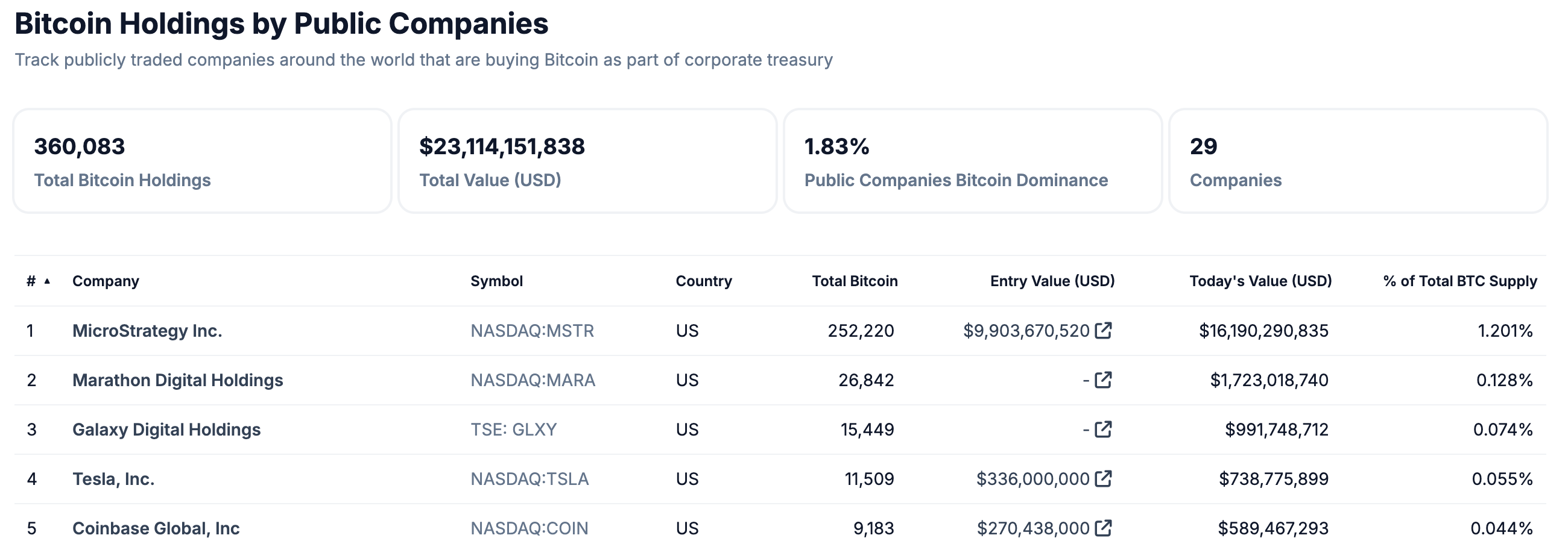 According to the list, companies with the largest BTC reserves are MicroStrategy, Marathon Digital Holdings, Galaxy Digital Holdings, Tesla, and Coinbase.