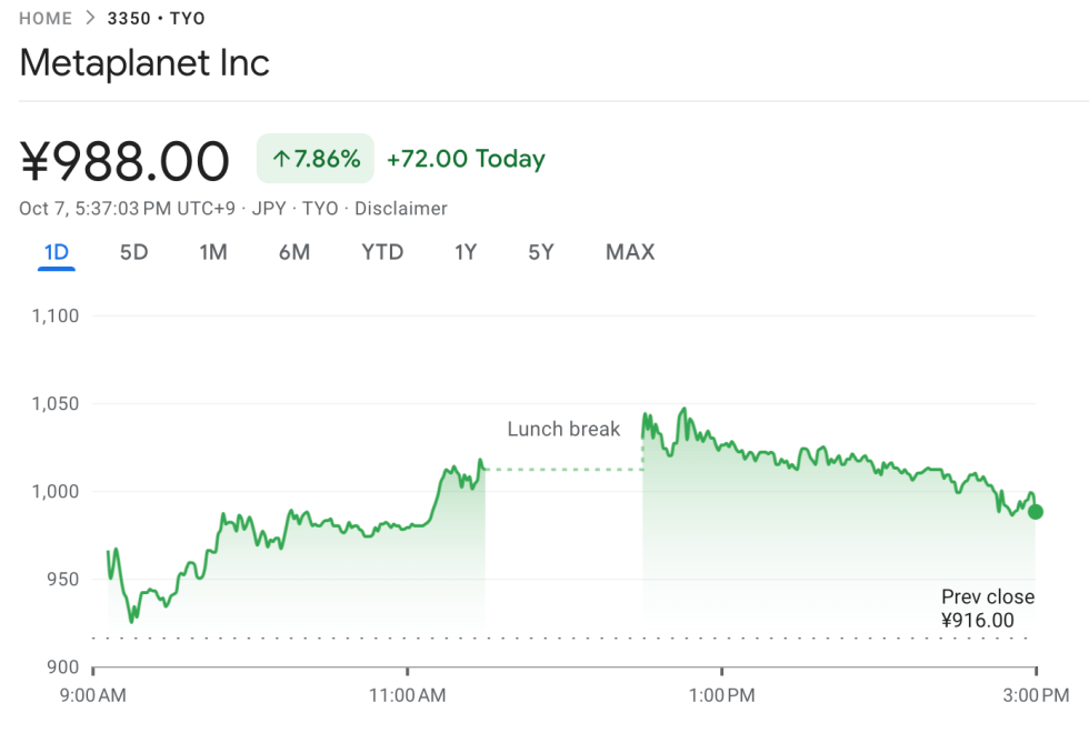 These developments appear to have little effect on Metaplanet’s Bitcoin thesis. Notably, the firm’s stock price surged following the latest BTC purchase, closing the day up 7.86%, with gains of 72 JPY (Japanese yen) or $0.49 USD.