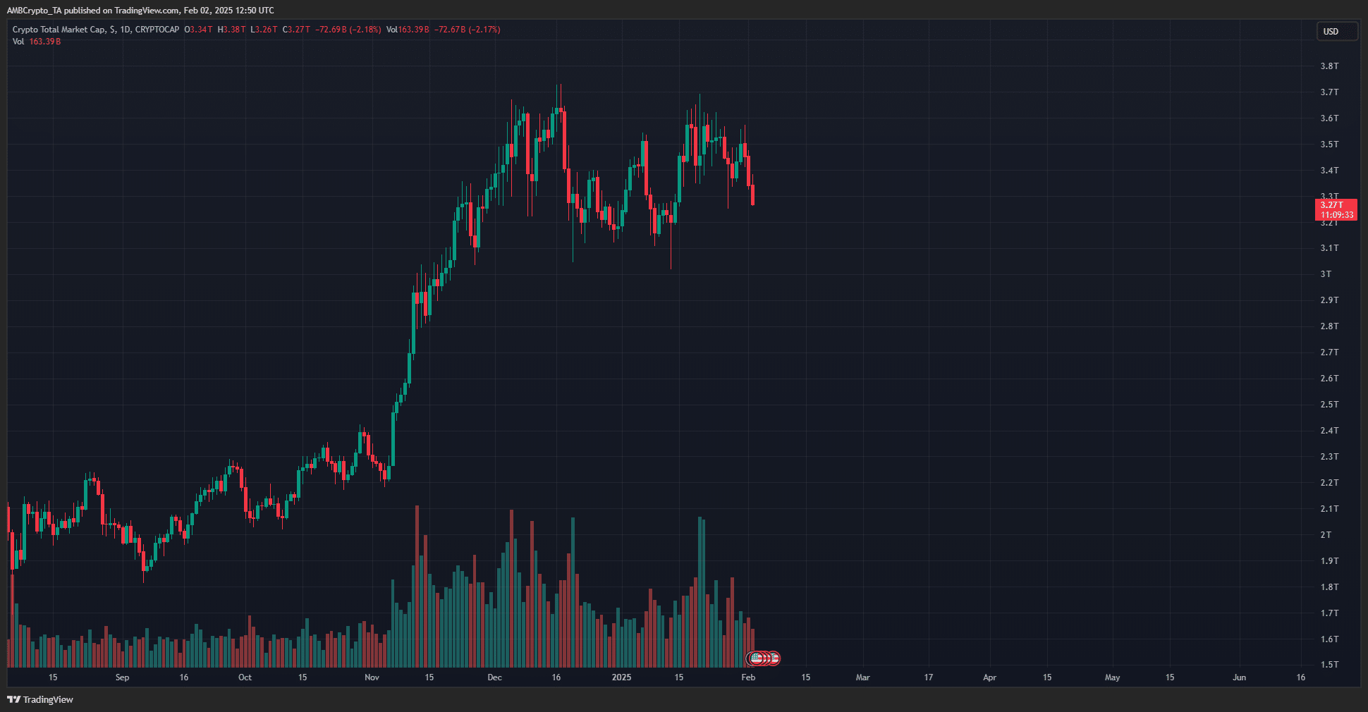 The crypto market cap has fallen 12.3% from $3.73 trillion to $3.42 trillion in six weeks. The bullish conviction in November and December when Bitcoin [BTC] raced toward and broke past the $100k mark has evaporated.