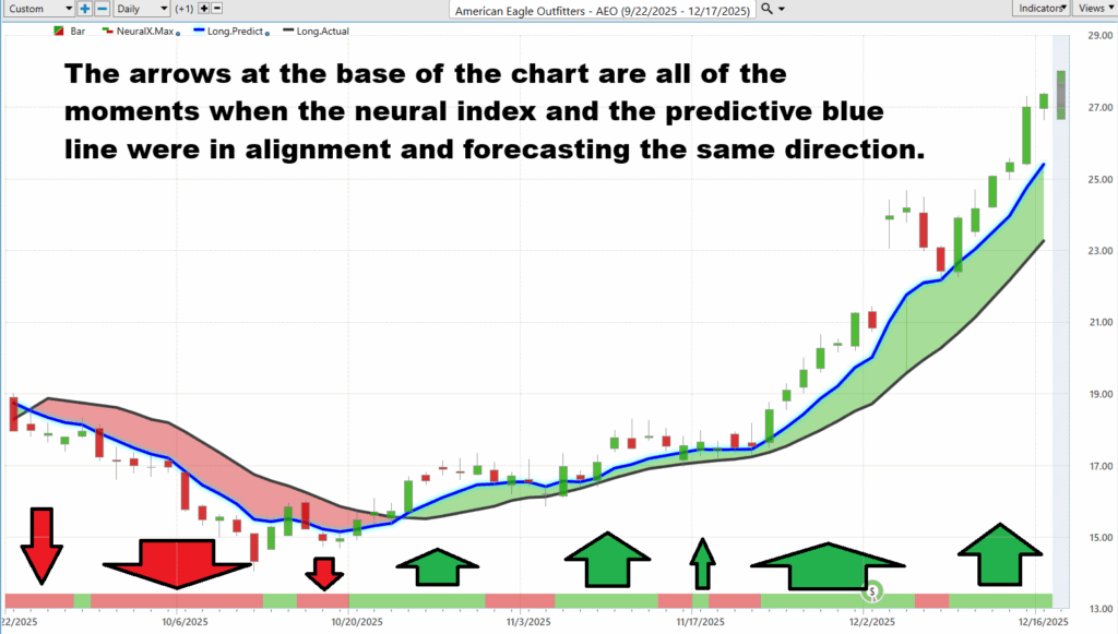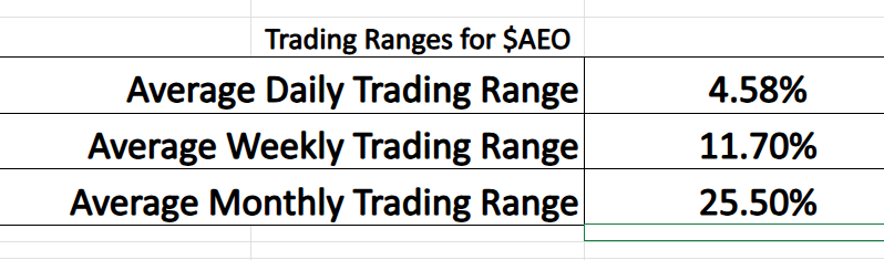 The first graphic adds context, but not confusion. Average daily, weekly, and monthly trading ranges remind us that AEO is an active stock — one that moves enough to reward discipline and punish hesitation. A 4.58% average daily range. Nearly 12% weekly. Over 25% monthly. Those numbers tell you volatility exists. But they don’t tell you how to trade it. They describe the battlefield without showing you where the lines are drawn.