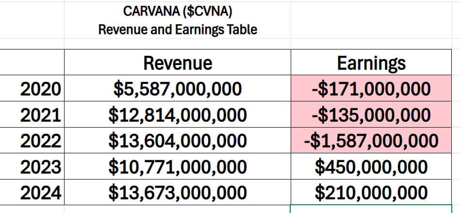Looking at Carvana’s revenue and earnings table is like watching a high-wire act performed over a financial canyon: impressive distance covered, but don’t look down too long. Revenue has climbed a staggering 145% over the last five years, a growth story loud enough to make even hardened skeptics raise an eyebrow. And yes, 2023 finally delivered the long-awaited turning point into profitability — proof that even companies with chaotic pasts can eventually stick a clean landing. But the numbers also tell a quieter, less glamorous truth: when you add it all up, Carvana has still lost more than $1.2 billion over that same five-year stretch. In other words, this is progress worth noting, but it’s the kind of progress that still carries the faint smell of smoke from all the fires they had to put out to get here.