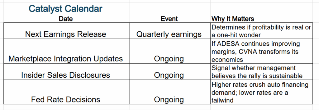 More importantly for traders: $CVNA now has two businesses — the retail platform and the marketplace segment powered by its ADESA auction acquisition. The marketplace business is the adult in the room, where margins are higher, headaches are fewer, and Wall Street starts seeing dollar signs instead of red flags.