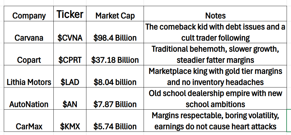 The takeaway: $CVNA is the high-volatility meme-stock-adjacent disruptor. Everyone else is the responsible adult wearing a seatbelt.