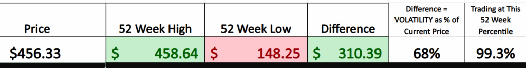 Take a good hard look at these graphics. They’re not just pretty colors and tidy columns — they’re the battlefield map. Price at $456.33, high at $458.64, low at $148.25, and the gap between those extremes clocks in at a monster $310.39. That’s not a market gently meandering along; that’s a prizefighter swinging haymakers. When a stock covers that much real estate in a year, it’s telling you something loud and clear: the crowd hasn’t made up its mind — but it sure isn’t bored.