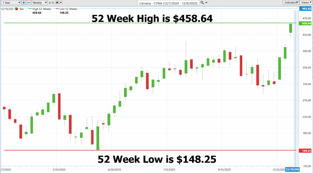When 2022–2023 arrived, the economy sobered up, interest rates ballooned, and $CVNA cratered 98% — which, in trader terms, means “put it on a watchlist immediately.” As we noted in our February 23, 2023 spotlight and again in July 2023, the meltdown was so spectacular that it practically begged for a reversal. Good traders monitor two things: what’s winning and where a stock sits relative to its 52-week range. When a stock has lost almost all its value, you don’t cry — you put on your “discriminating trader hat” and watch closely for liftoff. And liftoff is exactly what happened.