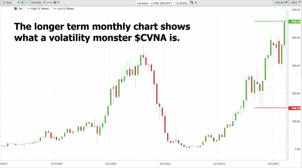 Carvana isn’t just a stock — it’s a full-blown Volatility Monster, the kind of beast that crawls out of the market’s basement, sprints to the rooftop, and then swan-dives back down for fun. This long-term chart looks less like price action and more like a seismograph measuring a decade of economic bad decisions. And now, with $CVNA charging back toward its highs, it’s reminding traders that chaos, apparently, is a renewable resource.