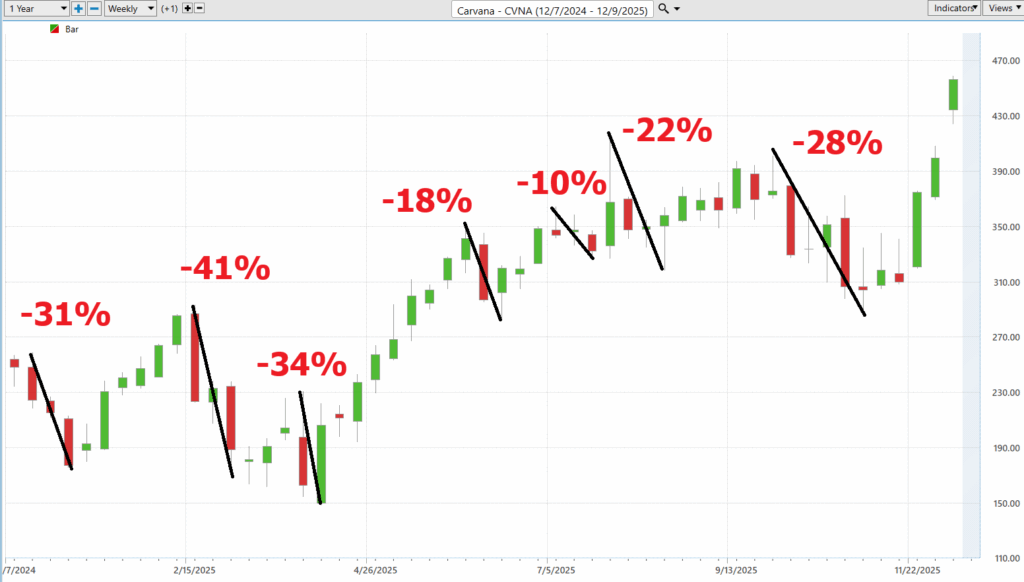 If you want a crash course in financial whiplash, just stare at these next two CVNA charts for sixty seconds. On one side you’ve got gut-punch pullbacks of –31%, –41%, –34%, –18%, –10%, –22%, –28%—the kind of declines that make weak hands reconsider their life choices. Flip the script and you’re blasted with steroid-level upside runs of +63%, +40.8%, +133%, +45%, +18%, +12%, +20%, +60% aggressive, violent mood swings that only a stock with a personality disorder could deliver. And that’s the point: this isn’t unusual for $CVNA. This is CVNA. Chaos is not the exception — it’s the operating system.