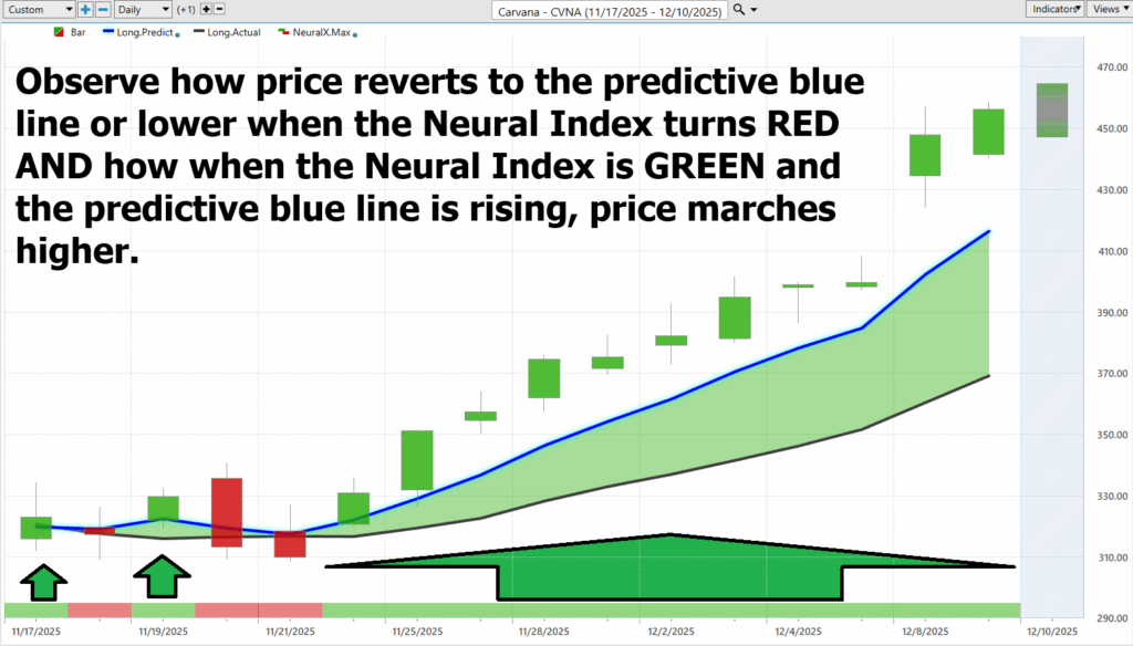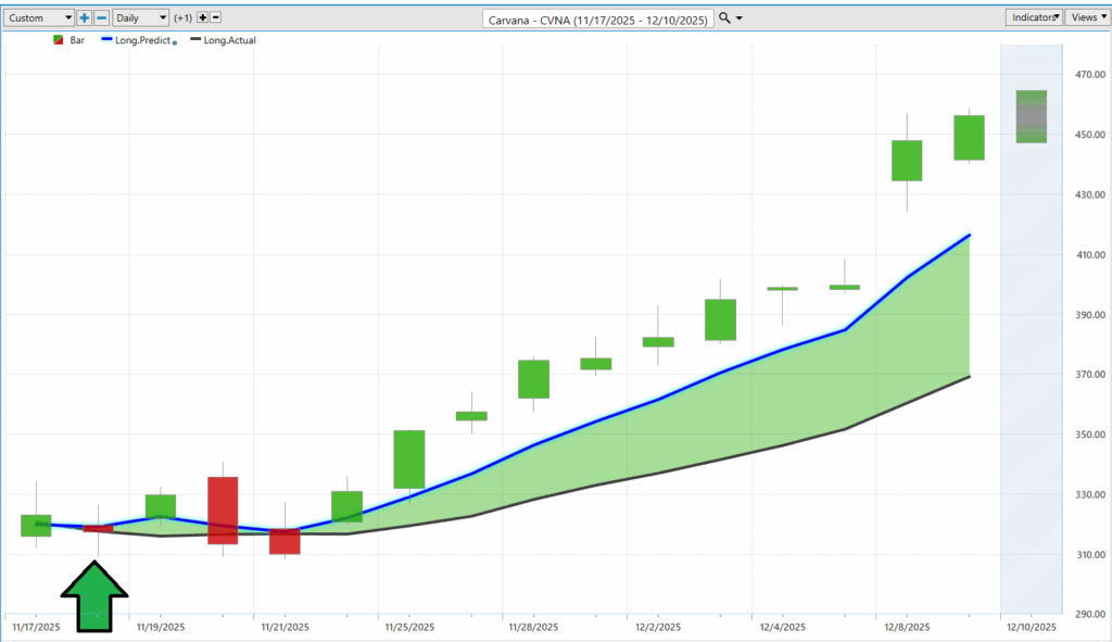 That’s where the following chart — the VantagePoint A.I. Daily Range Forecast — strolls in like the adult in the room, tapping the map and saying, “Here. Price is likely to go here today.” No broad strokes, no statistical fog — just precise upper and lower boundaries laid out before the market even rings the opening bell. Suddenly those monster daily swings are no longer chaotic; they’re navigable. The A.I. doesn’t just describe volatility; it choreographs it. And for traders trying to survive CVNA’s daily rodeo, that’s not just useful — it’s the difference between riding the bull and becoming part of the floor.