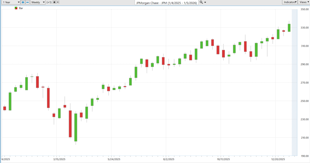 The table offers a rare moment of clarity in a market often dominated by narrative. When JPM’s returns are placed alongside the major indexes, the distinction is not subtle. Over the past year, the stock is up 37.6%, more than doubling the gains of the S&P 500 and comfortably outpacing the Nasdaq and Dow. That outperformance is not confined to a single time frame, either. Whether measured over six months, one month, or one week, JPM consistently sits at or near the top of the list. This is not an argument built on storytelling; it is an argument built on arithmetic.