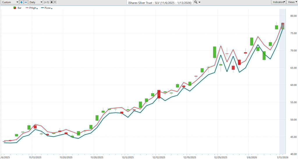 Silver, it turns out, has no interest in modesty. The charts show $SLV repeatedly doing what polite markets are not supposed to do, making new all-time highs and then acting as if that were simply the next item on the agenda. That alone is noteworthy, because markets that keep printing highs are telling you something important. They are not debating value, they are discovering it. Even more revealing is the steadily expanding annual trading range, which is the market’s way of announcing that calm certainty has left the building and both volatility and opportunity have taken up residence.