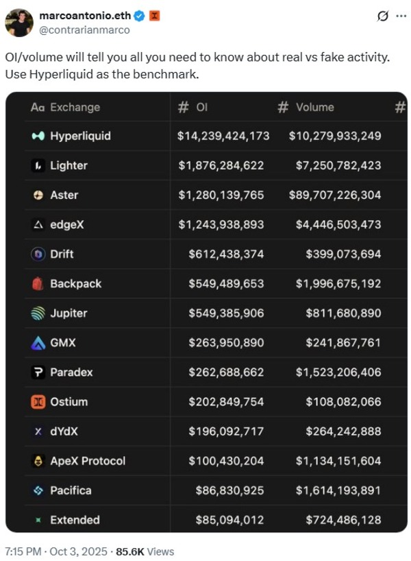 Ostium Labs CTO Marco Ribeiro points to open interest stats on Oct. 3 to filter out fake activity. Source: Marco Ribeiro