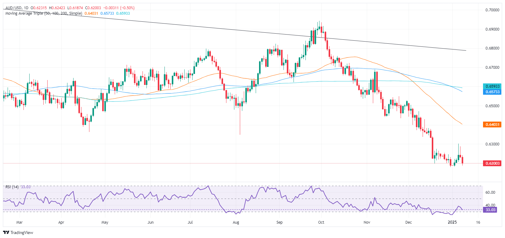 The Australian dollar posted losses of over 0.40% against the US Dollar, and the latter remains supported by US President-elect Donald Trump’s tariff threats. At the time of writing, the AUD/USD trades at 0.6204 after bouncing off daily lows of 0.6187.