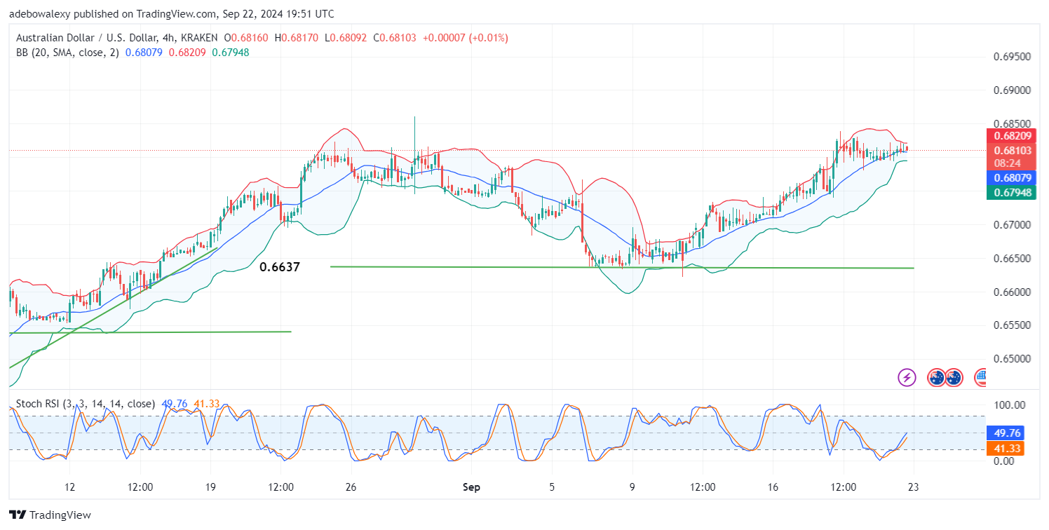 Technically, this contraction hints at a potential upward correction that may receive more momentum. Meanwhile, the Stochastic RSI lines are already at the 100 level, moving sideways. This behavior suggests that upward forces may still have the chance to propel the market higher. Given the BB indicator’s contraction, traders can aim for the 0.6850 threshold.
