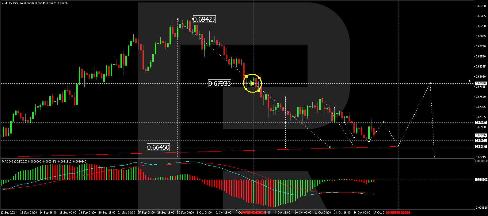 On the hourly chart, AUD/USD has completed a downward wave to 0.6660, followed by a corrective rise to 0.6700. The pair is expected to continue its decline to the 0.6645 level. After this target is met, a potential reversal could push the price towards 0.6710. The Stochastic oscillator supports this outlook, with its signal line below 50 and heading towards 20, suggesting that there may be further downside before any significant recovery.