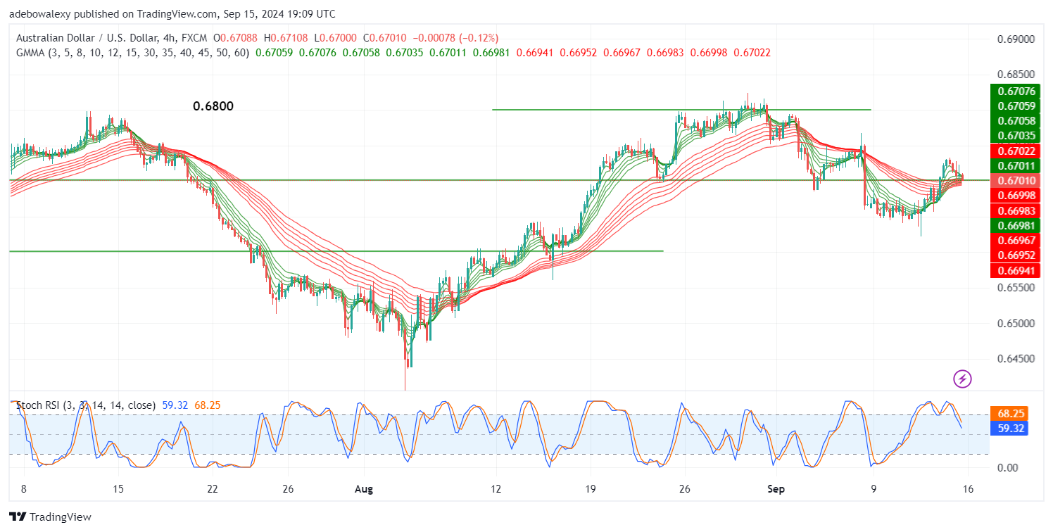 In the AUD/USD 4-hour market, downward forces appear to be gaining strength progressively. The most recent price candle on the chart is red, standing at the 0.6700 baseline. The pair now trades below six GMMA indicator lines. Additionally, the Stochastic RSI lines are plunging steeply toward the 50 level of the indicator.