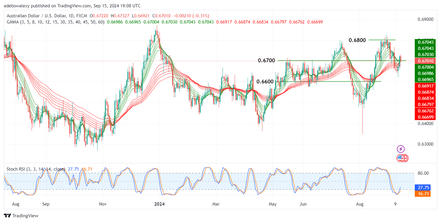 Price action in the daily AUD/USD market remains above the 0.6700 threshold. The most recent price candle on the chart has brought the pair slightly downward, now trading below three green Guppy Multiple Moving Average (GMMA) curves. Meanwhile, the Stochastic Relative Strength Index (RSI) lines are still projected upwards, though they remain in the oversold region.