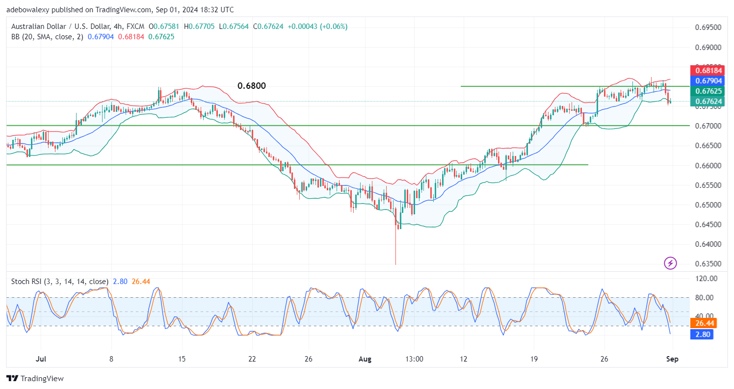 Price action in the AUD/USD 4-hour market has approached the support level at 0.6750. However, the last price candle rebounded off the technical support level at the 0.6750 threshold. This price level also seems to coincide with the lowest limit of the BB indicator. The last price candle on this chart reveals that downward forces are active and trying to push prices lower.