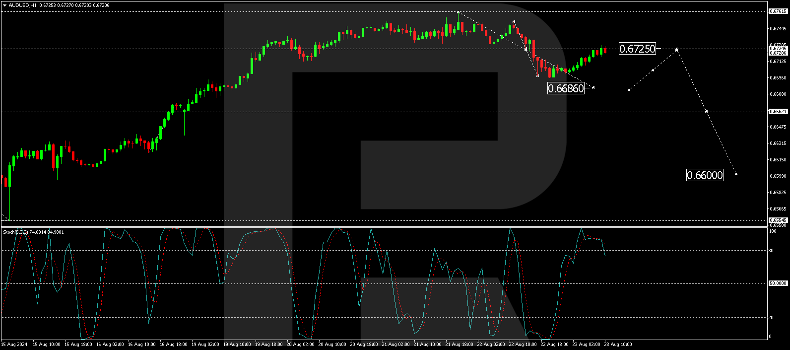 In the hourly frame, AUD/USD has retraced from a recent low of 0.6696 to 0.6725, indicating a corrective phase. The anticipated continuation of this downtrend could see the pair targeting 0.6686 shortly. If this support holds, a rebound to 0.6725 could follow. The Stochastic oscillator indicates an overbought condition, with the signal line expected to move downwards from 80 to 20, supporting the potential for further declines.