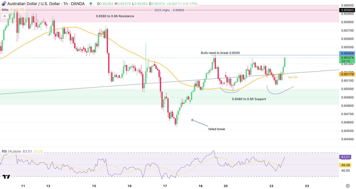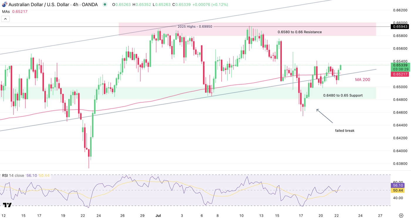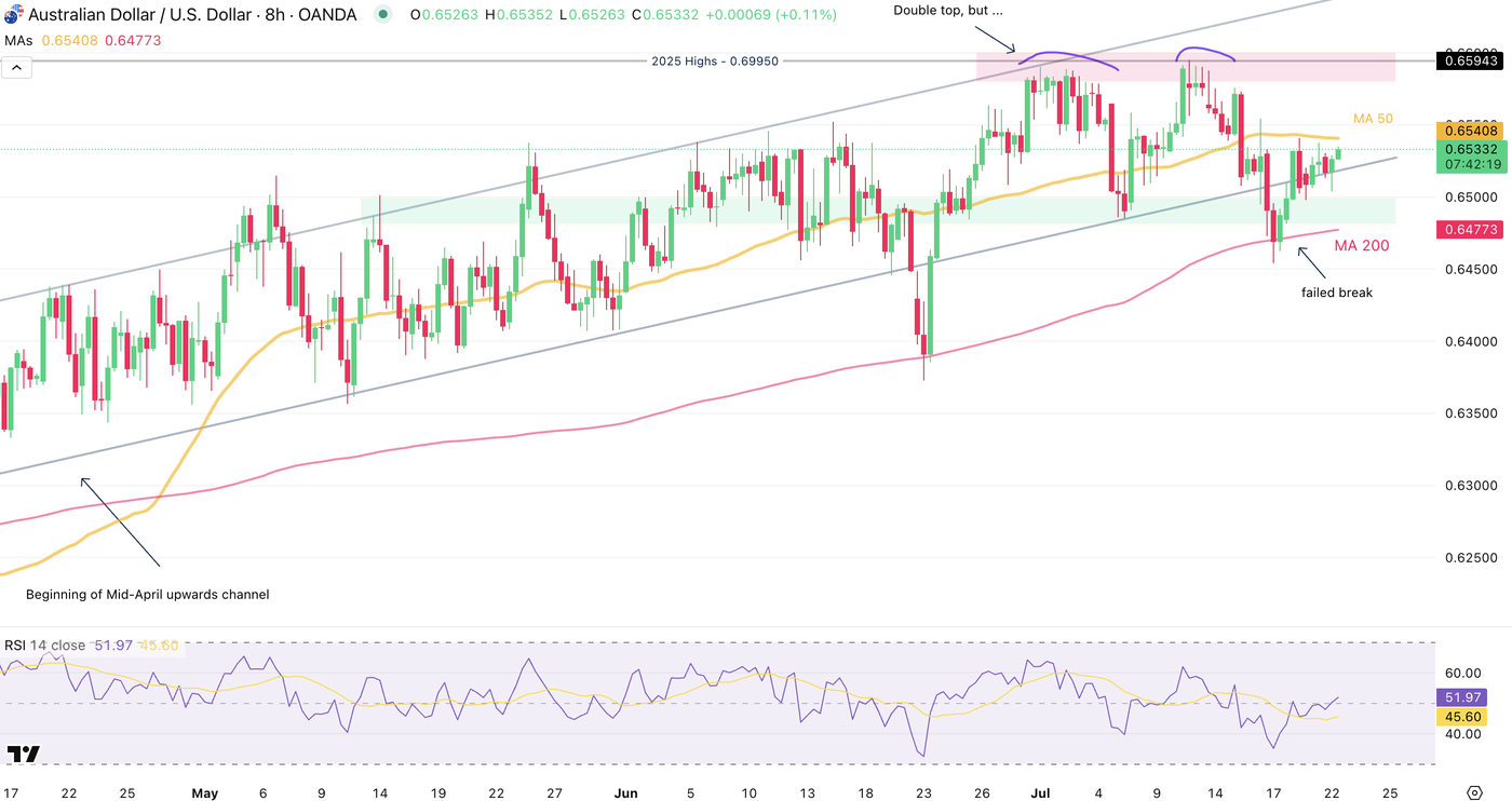 Buyers have held a retest of the lower trendline forming what could be a short-term double-bottom – a failure to break the 0.6540 (coinciding with the 8H MA 50) will point towards a rangebound consolidation.