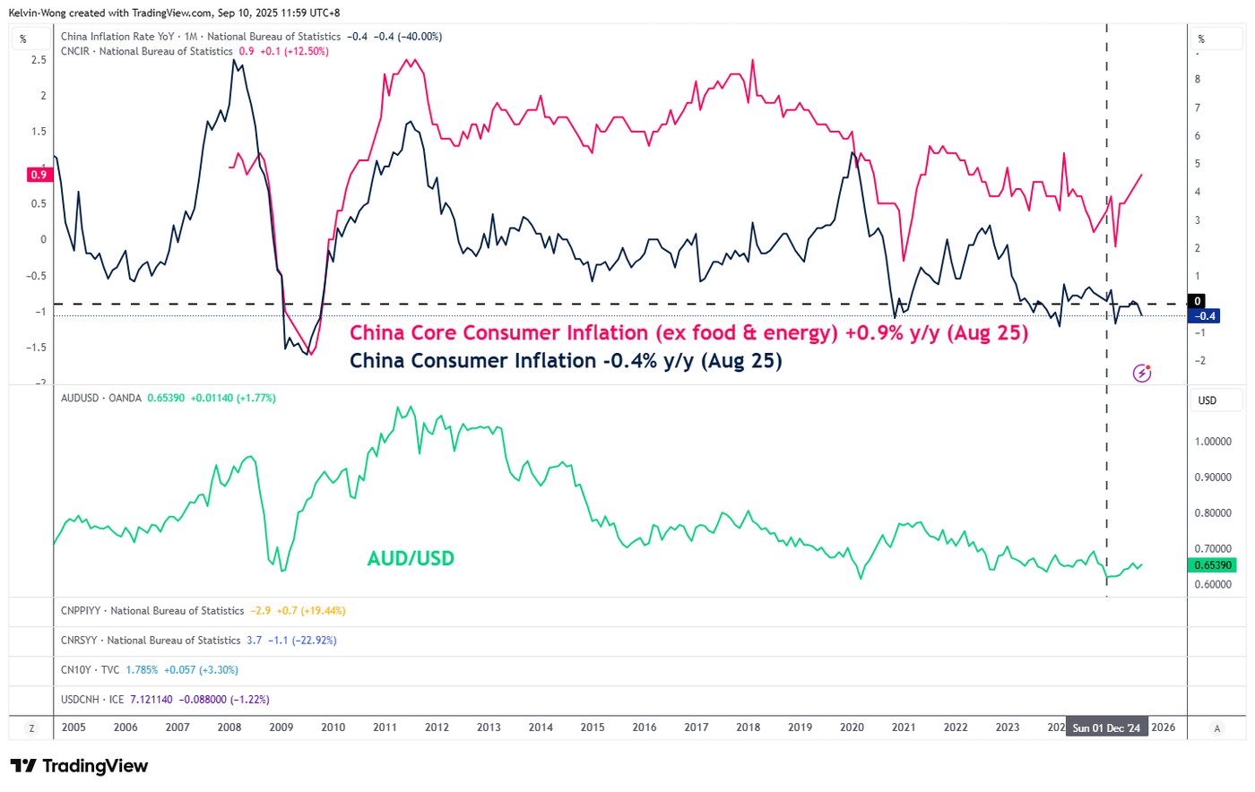Despite the weaker-than-expected headline China’s consumer prices (CPI) that dropped to -0.4% y/y in August from a flat reading in July, and missing forecasts of a -0.2% y/y fall, the core CPI (excluding food and energy) has improved to a further positive reading of 0.9% y/y in August from 0.8% y/y in July,