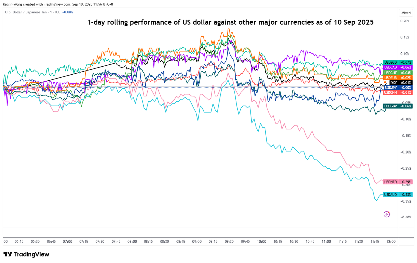 In today’s Asia session, on 10 September, the Australian dollar is the strongest-performing currency among the majors against the US dollar. Based on a one-day rolling performance, the USD/AUD cross rate has declined by -0.3%, much more than the US Dollar Index, which is trading almost unchanged (see Fig. 1).